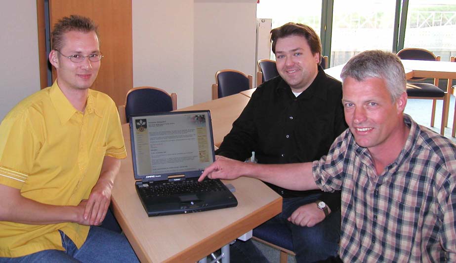 Die "Webmaster" Constantin Dabelstein und Malte Steckmeister präsentieren Bürgermeister Randolf Knudsen die neue Internetseite www.delingsdorf.de