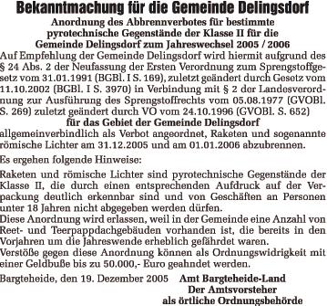 Anordnung des Abbrennverbotes für bestimmte pyrotechnische Gegenstände der Klasse II für die Gemeinde Delingsdorf zum Jahreswechsel 2005 / 2006