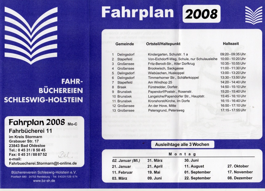 Mit Beginn des Jahres ist ein neuer Fahrplan für den Bücherbus in Kraft getreten. Dabei haben sich einige Änderungen ergeben, so ist der neue Bücherbustag in Delingsdorf der Montag und die Haltestelle "Op de Barg" wird nicht mehr bedient. Dafür hält der Bücherbus vormittags am Kindergarten. Die Uhrzeiten haben sich ebenfalls geändert.