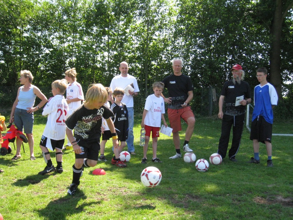 Für die Mädchen gab es zusätzlich einige Spiele und kleine Übungen rund um den Fußball, die regen Zuspruch fanden. Ein Highlight war das 8m-Schießen gegen die Torhüterin unserer B-Mädchen, wobei die Siegerin mit einem Fußball belohnt wurde. Alle Teilnehmerinnen konnten außerdem einen Miniball zum Kicken und ein Erinnerungs-T-Shirt des DFB mitnehmen. Ebenso erhielten die Absolventen des Schnupperabzeichens ihre Urkunde sowie nachträglich ein T-Shirt. Zum Abschluss bildeten alle Teilnehmer sowie unsere B-Mädchen gemischte Mannschaften und spielten ein Turnier jeder gegen jeden. Im Vordergrund stand der Spaß an der Bewegung und alle trafen sich auch hier erschöpft am Mehrzweckhaus zu einer kleinen Stärkung.