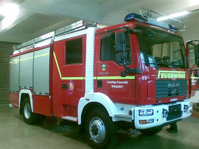 Ein erster Schnappschuß des Fahrzeugs, direkt nach Ankunft beim Hersteller. Obwohl es nur ein niedrig auflösendes MMS-Bild ist, kann man den Schriftzug "Freiwillige Feuerwehr Delingsdorf" und das Wappen erkennen.