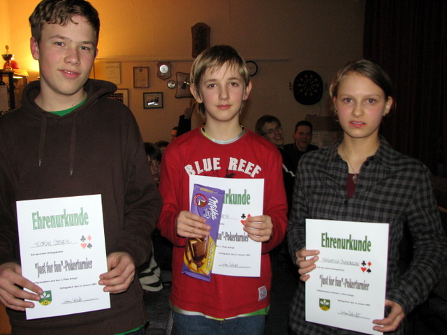 Die meisten Chips konnte Nils Meifarth (12) sammeln und gewann somit eine große Tafel Schokolade. Die Plätze 2 und 3 wurden belegt durch Florian Cornehl (14) und Katharina Blaschkowski (14). Wir gratulieren den Gewinnern und danken allen für Eure Teilnahme. Wir hoffen, es hat allen viel Spaß gemacht und wir können mit Euch zusammen ein weiteres Turnier starten.