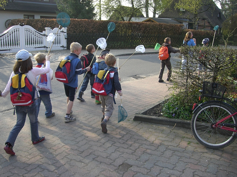 Die Strusbek, die Feuerlöschteiche und die Regenrückhaltebecken waren die Ziele. In vier Gruppen waren die Kinder mit den Begleitern unterwegs und untersuchten die Temperatur, die Lebewesen in und an den Gewässern, die Tiefe und den Umfang der Teiche und Becken. Was oder wer kann schwimmen? Viele interessante Dinge gab es zu entdecken und so wurde schnell vergessen, dass das Wasser tief und nass war. Interessant wie viel Wasser in die Gummistiefel passt. Diverse Schuhe, Strümpfe und Hosen mussten bereits unterwegs gewechselt werden. Müde aber zufrieden trafen alle zum Mittagessen im Mehrzweckhaus ein. Hier gab es passend zum Tagesthema Fischstäbchen mit Pommes.