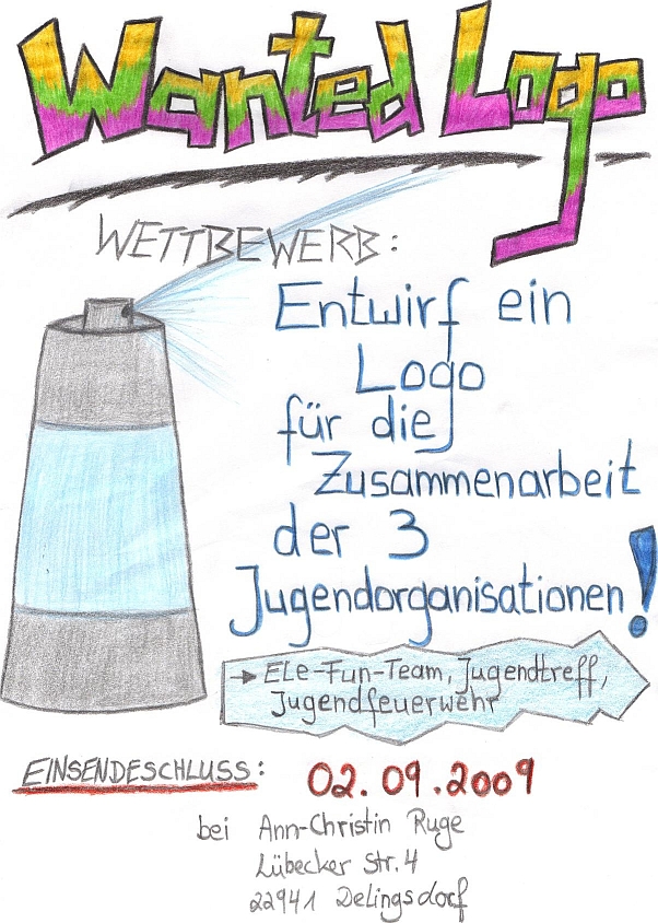 Alle diese Vereine haben sich mit der Gemeinde zusammen gesetzt um die Jugendarbeit besser zu verknüpfen. Das erste Ergebnis haltet ihr in euren Händen. Aber wie alles, soll dieser Jugendflyer nicht nur von einem gestaltet und geschrieben werden, sondern es wäre toll, wenn sich ganz viele, wenn auch immer nur für eine Ausgabe, daran beteiligen. Der Jugendflyer soll neben dem neuen Logo einen Namen bekommen. Der schon angekündigte Logowettbewerb geht nun endlich in die heiße Phase. Wer von euch ist kreativ? Wer kann gut Zeichnen oder hat einfach eine hammer Idee? Macht euch an die Bleistifte und legt los! Wir freuen uns über jeden Beitrag. Auch einen Namen brauchen wir noch für unseren Jugendflyer. Am besten natürlichen einen tollen! Schickt eure Vorschläge bitte auch bis zum 02.09.09 an meine E-Mail Adresse. Wenn ihr Fragen oder Kommentare zu diesem Jugendflyer habt oder bei der nächsten Ausgabe mithelfen wollt, schreibt mir 'ne Mail an ronja.knudsen@googlemail.com