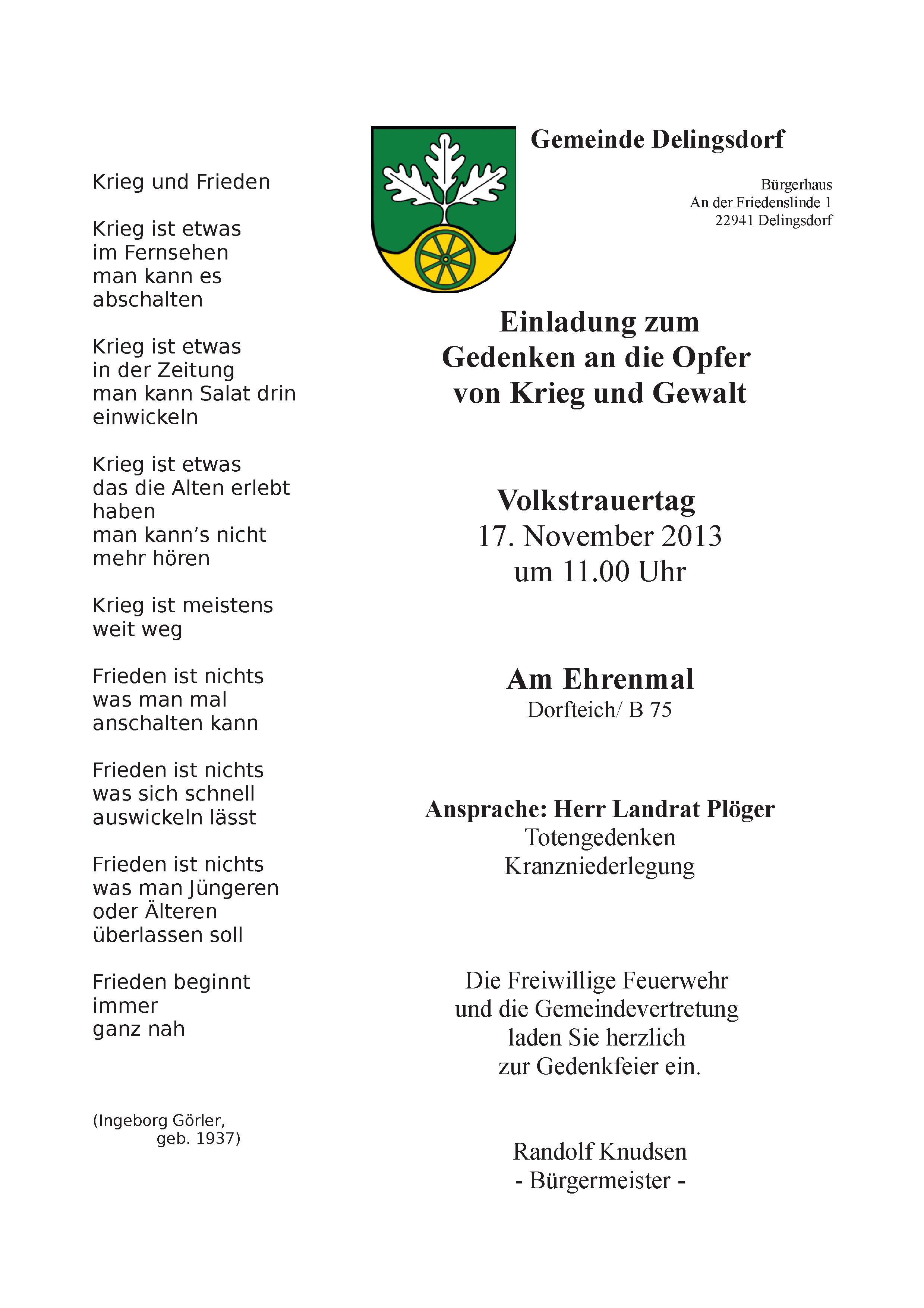 Die Freiwillige Feuerwehr und die Gemeindevertretung laden Sie herzlich zur Gedenkfeier am Ehrenmal am 17. November um 11:00 Uhr ein.