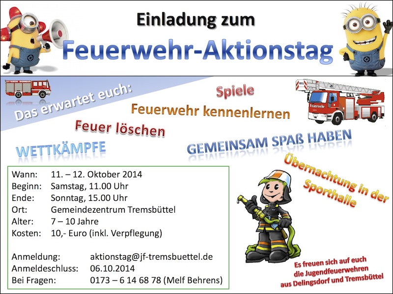 wie ihr sicher schon von euren Kindern gehört habt, findet am ersten Wochenende der Herbstferien von Samstag, dem 11. Oktober, bis Sonntag, dem 12. Oktober, im Gemeindezentrum unser erster Feuerwehraktionstag gemeinsam mit der Jugendfeuerwehr Delingsdorf statt. Beginn ist am Samstag für die Mitglieder der Jugendfeuerwehr um 9.00 Uhr (Treffen an der Wache). Enden wird die Veranstaltung am Sonntag gegen 15.00 Uhr.