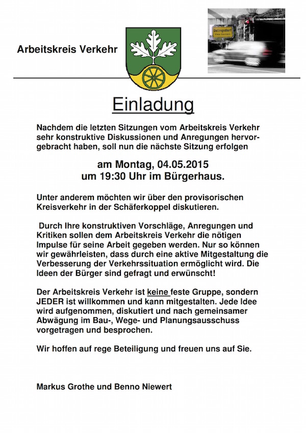 Nachdem die letzten Sitzungen vom Arbeitskreis Verkehr sehr konstruktive Diskussionen und Anregungen hervorgebracht haben, soll nun die nächste Sitzung erfolgen am Montag, 04.05.2015 um 19:30 Uhr im Bürgerhaus.
