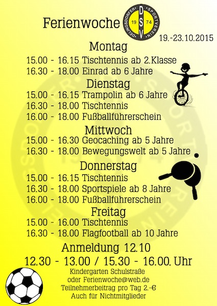 Der Sportverein bietet mit seiner Ferienwoche vom 19. bis 23. Oktober eine tolle Möglichkeit, seine Freizeit aktiv mit anderen gemeinsam zu gestalten. Täglich jeweils ab 15:00 Uhr werden abwechslungsreiche Aktionen angeboten, dabei spielt es keine Rolle, ob die Kinder aktiv im Verein tätig sind oder nur so mitmachen möchten. Pro Tag hat jeder Teilnehmer 2 Euro beizutragen.