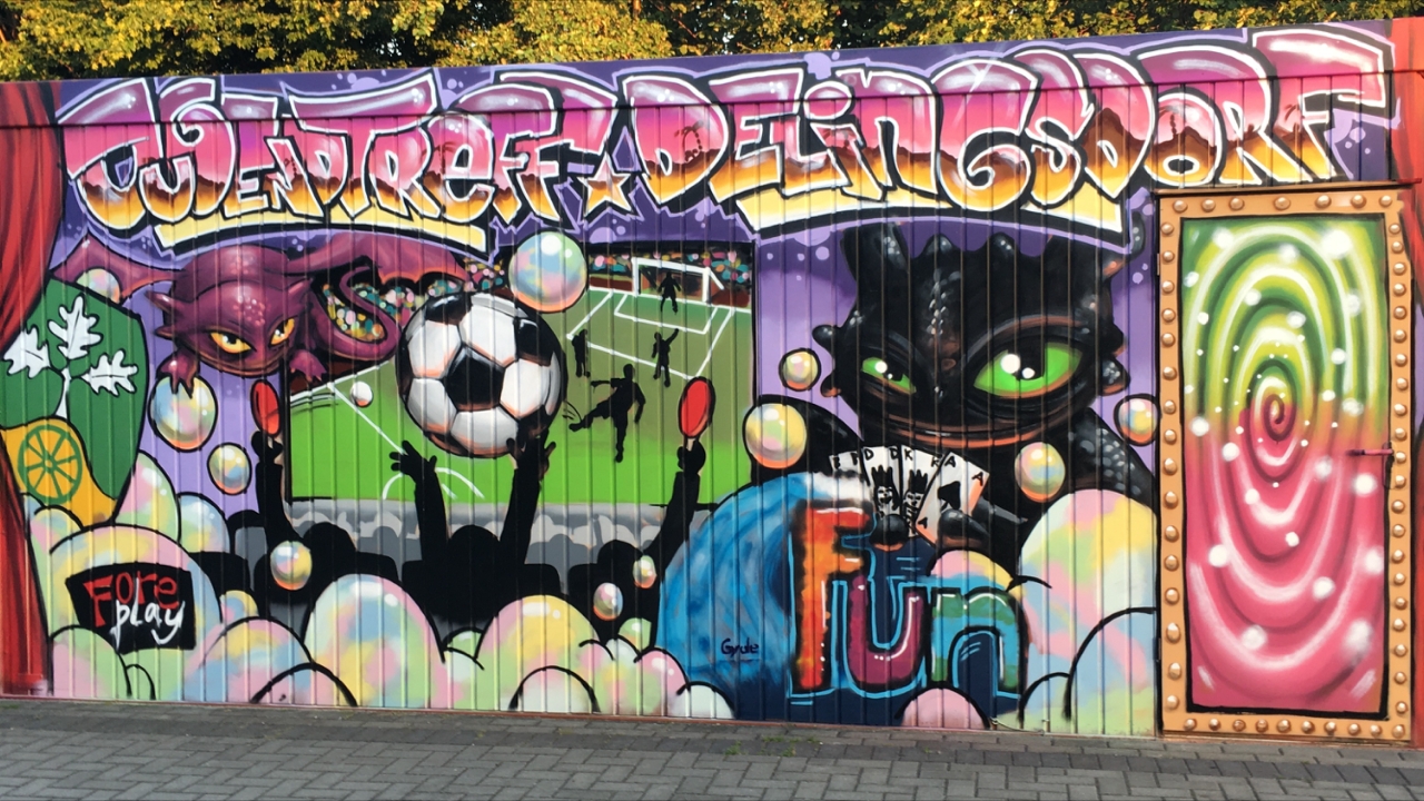Ein Profisprayer war zur Einweisung und Unterstützung der Kinder mit dabei. Es wurden zunächst Vorlagen auf Papier gebracht, bevor es an die Dosen ging. Von 10:00 bis 20:00 Uhr wurde gesprayt und zwischendurch gegrillt. Das Ergebnis kann sich sehen lassen, wir hatten alle viel Spaß und auch der Wettergott hat mitgespielt.