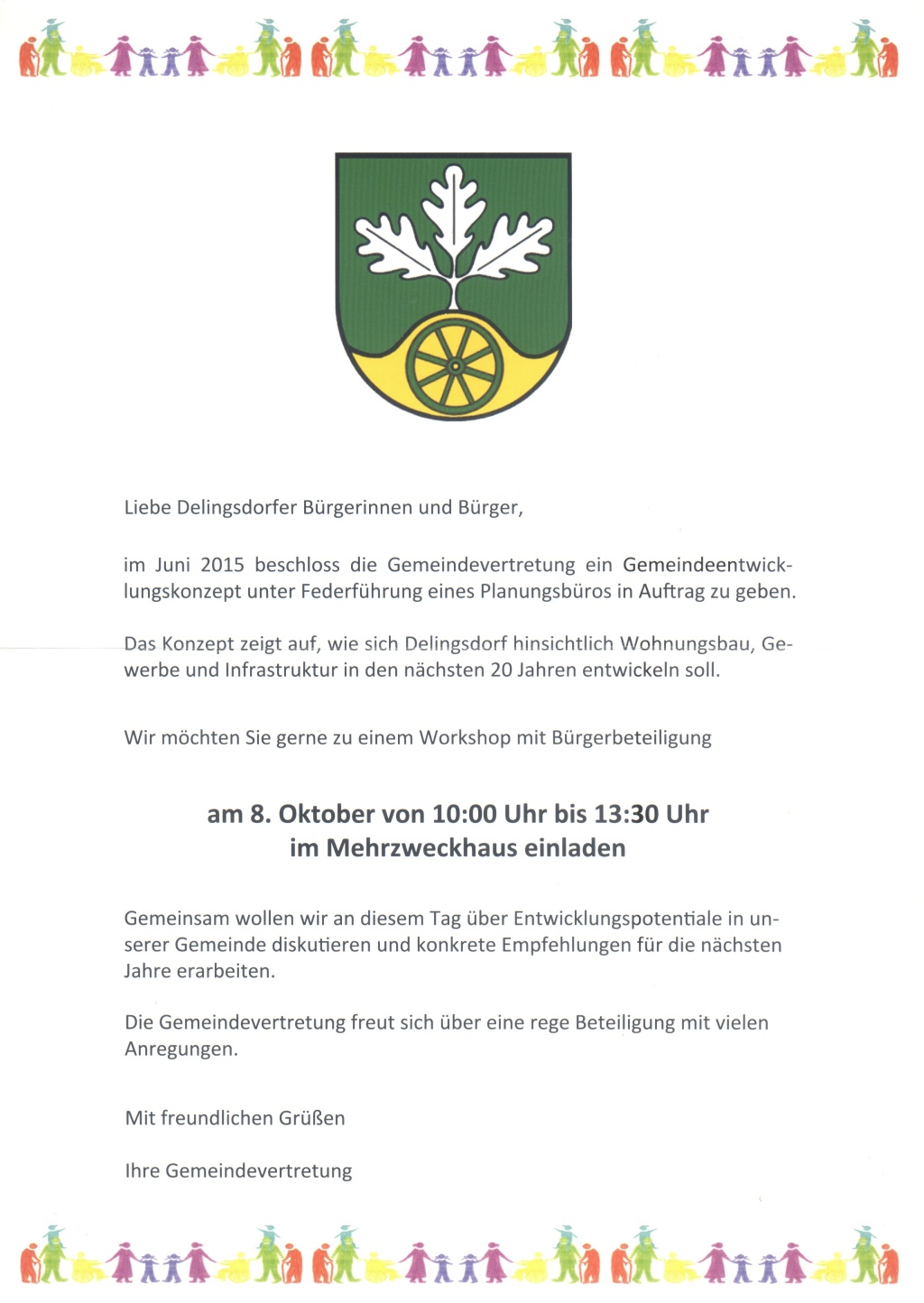Liebe Delingsdorfer Bürgerinnen und Bürger, wir möchten Sie gerne zu einem Workshop mit Bürgerbeteiligung im Mehrzweckhaus einladen.