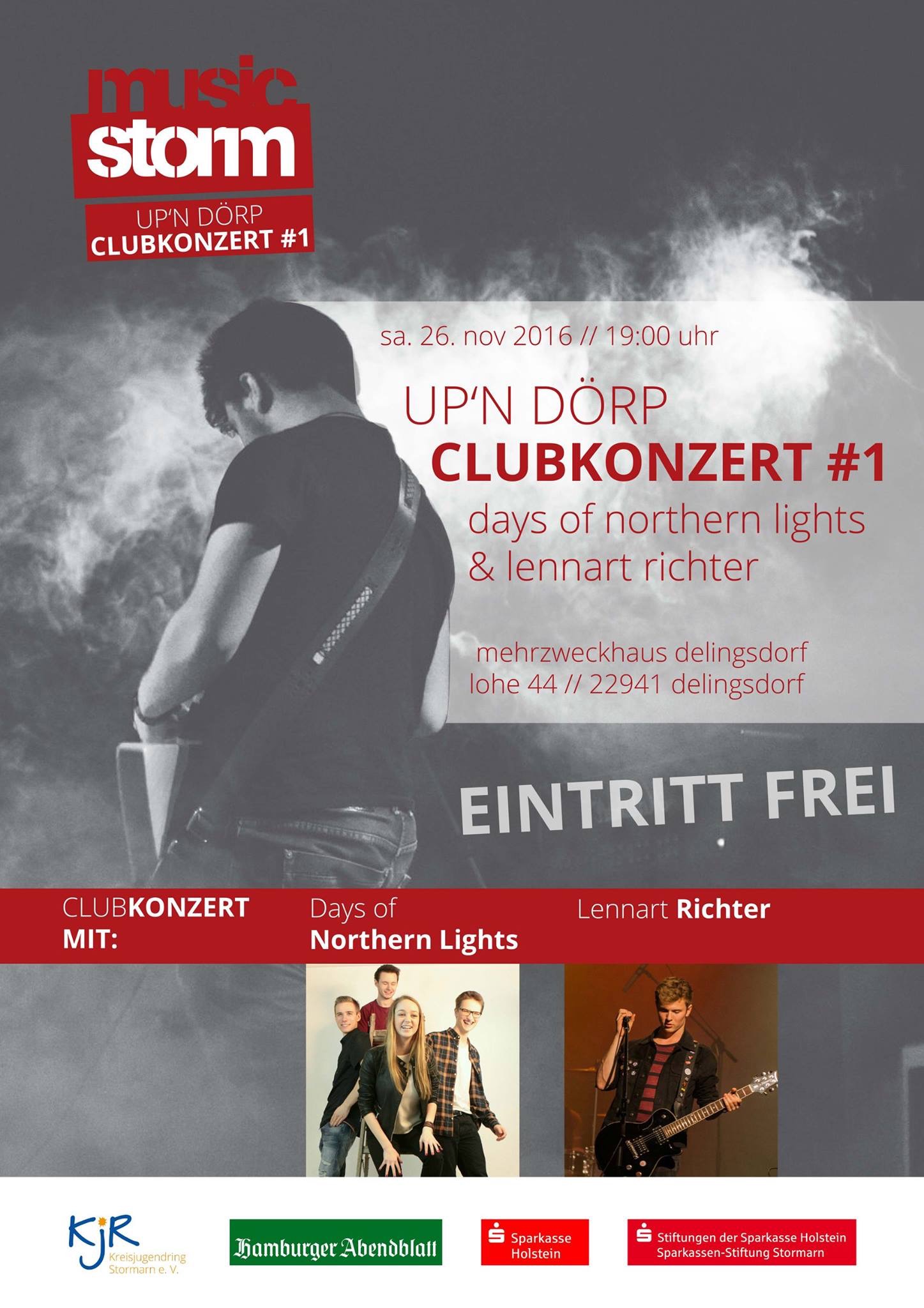Das music storm Up'n Dörp - Konzert findet am Samstag, den 26.11., um 19 Uhr im Mehrzweckhaus Delingsdorf (Lohe 44) statt - Kommt vorbei, der Eintritt ist kostenlos!