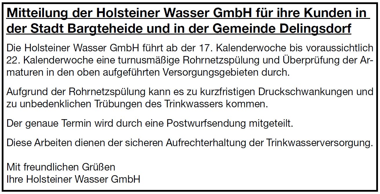 Die Holsteiner Wasser GmbH führt ab der 17. Kalenderwoche bis voraussichtlich 22. Kalenderwoche eine turnusmäßige Rohrnetzspülung und Überprüfung der Armaturen in Delingsdorf durch. Aufgrund der Rohrnetzspülung kann es zu kurzfristigen Druckschwankungen und zu unbedenklichen Trübungen des Trinkwassers kommen. Der genaue Termin wird durch eine Postwurfsendung mitgeteilt.