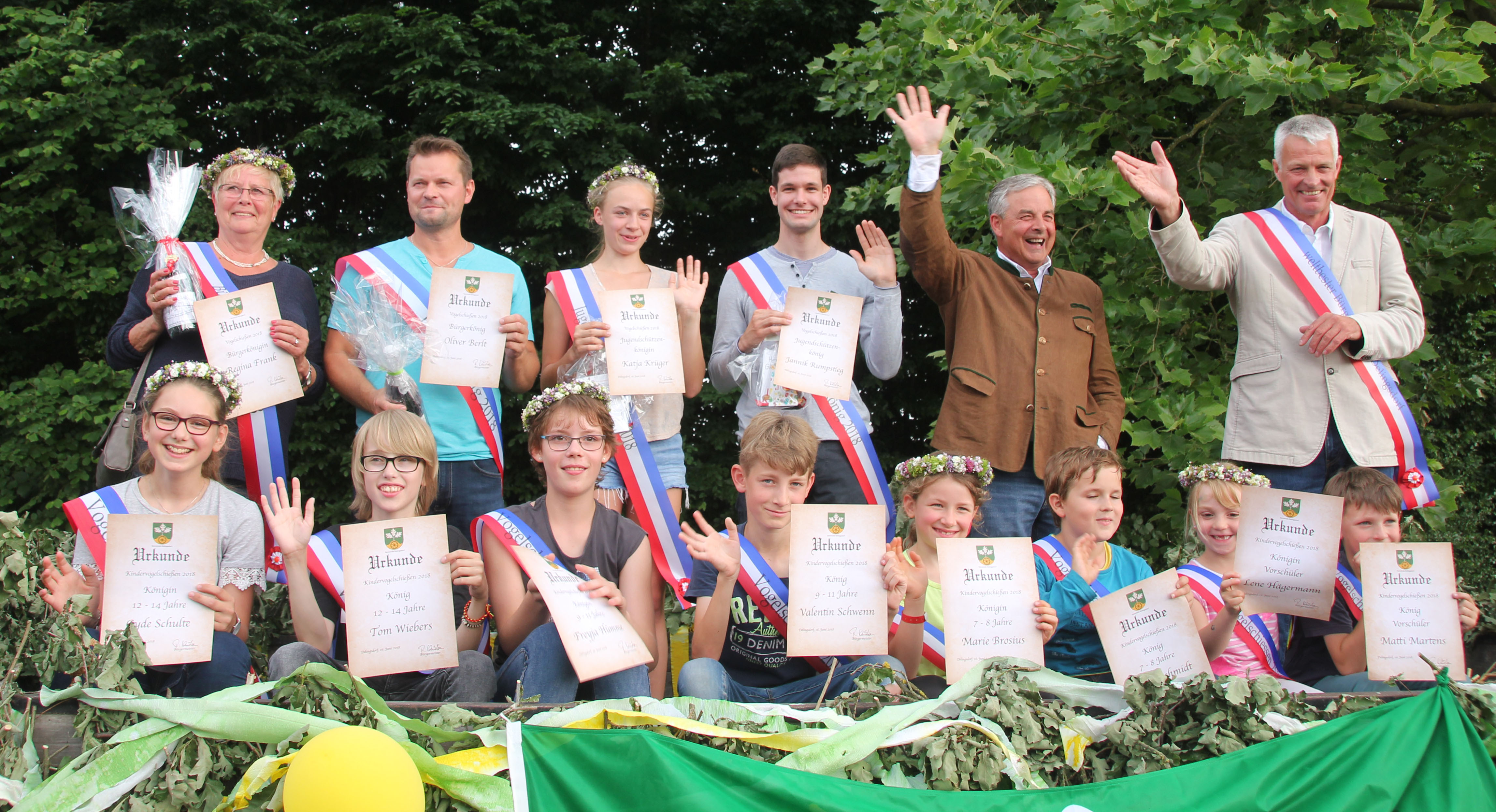 Am vergangenen Wochenende 16.06.18 war es wieder soweit: Unser traditionelles Vogelschießen wurde ausgespielt. 180 angemeldete Kinder in 4 Altersklassen spielten die Königinnen und Könige aus. Punkt 14:30 Uhr als die Spiele starten sollten, regnete es (nach sieben Wochen Trockenheit) wie aus Eimern … Gott sei Dank sind wir alle erprobt und warteten geduldig auf die nächste wolkenfreie Phase. Nachdem alle Spiele trockengelegt waren, konnten wir um15:00 Uhr beginnen. Die Sonne kam zurück und plötzlich waren gefühlte 28 Grad auf dem Platz.