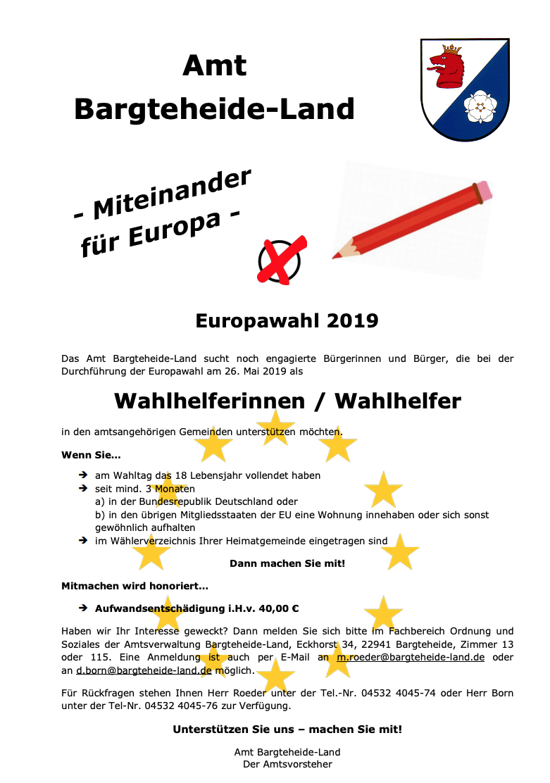 Mi. 08.05.2019 Gemeinde Wahlhelfer gesucht! Das Amt Bargteheide-Land sucht noch Wahlhelfer für die Europawahl am 26. Mai. Auch Delingsdorf braucht noch Verstärkung! Mehr Infos: https://www.bargteheide-land.de/cms/fileadmin/files/amt/bekanntmachungen/eu_wahl_wahlhelferInnen.pdf