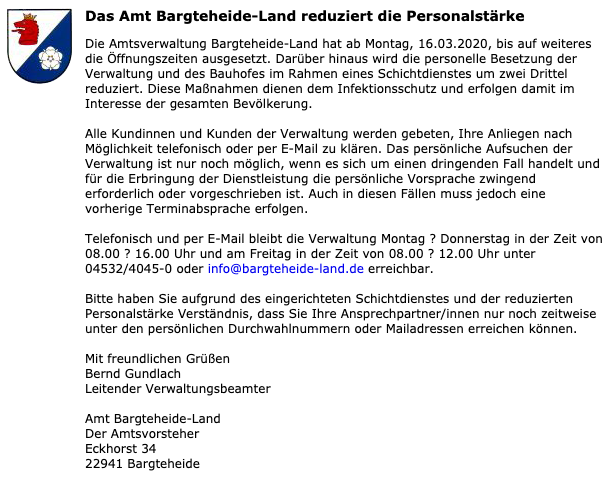 Die Amtsverwaltung Bargteheide-Land hat ab Montag, 16.03.2020, bis auf weiteres die Öffnungszeiten ausgesetzt. Darüber hinaus wird die personelle Besetzung der Verwaltung und des Bauhofes im Rahmen eines Schichtdienstes um zwei Drittel reduziert. Diese Maßnahmen dienen dem Infektionsschutz und erfolgen damit im Interesse der gesamten Bevölkerung.