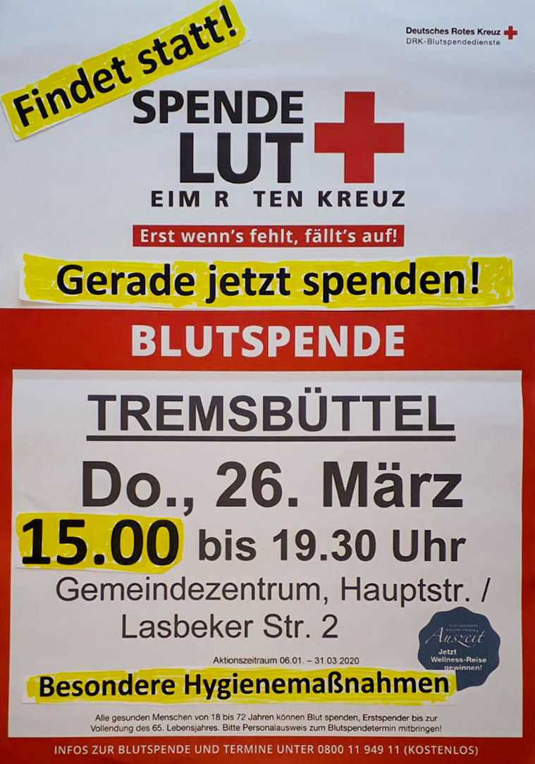 Da laut dem Blutspendedienst derzeit viele Blutspendetermine ausfallen, hat das DRK eine Sondergenehmigung erhalten, um am Donnerstag, den 26.03.2020 von 15:00 Uhr bis 19:30 im Gemeindezentrum Tremsbüttel die Möglichkeit zur Blutspende zu geben. Selbstverständlich werden zusätzliche hygienische Maßnahmen durchgeführt, damit das Blutspenden sicher bleibt.