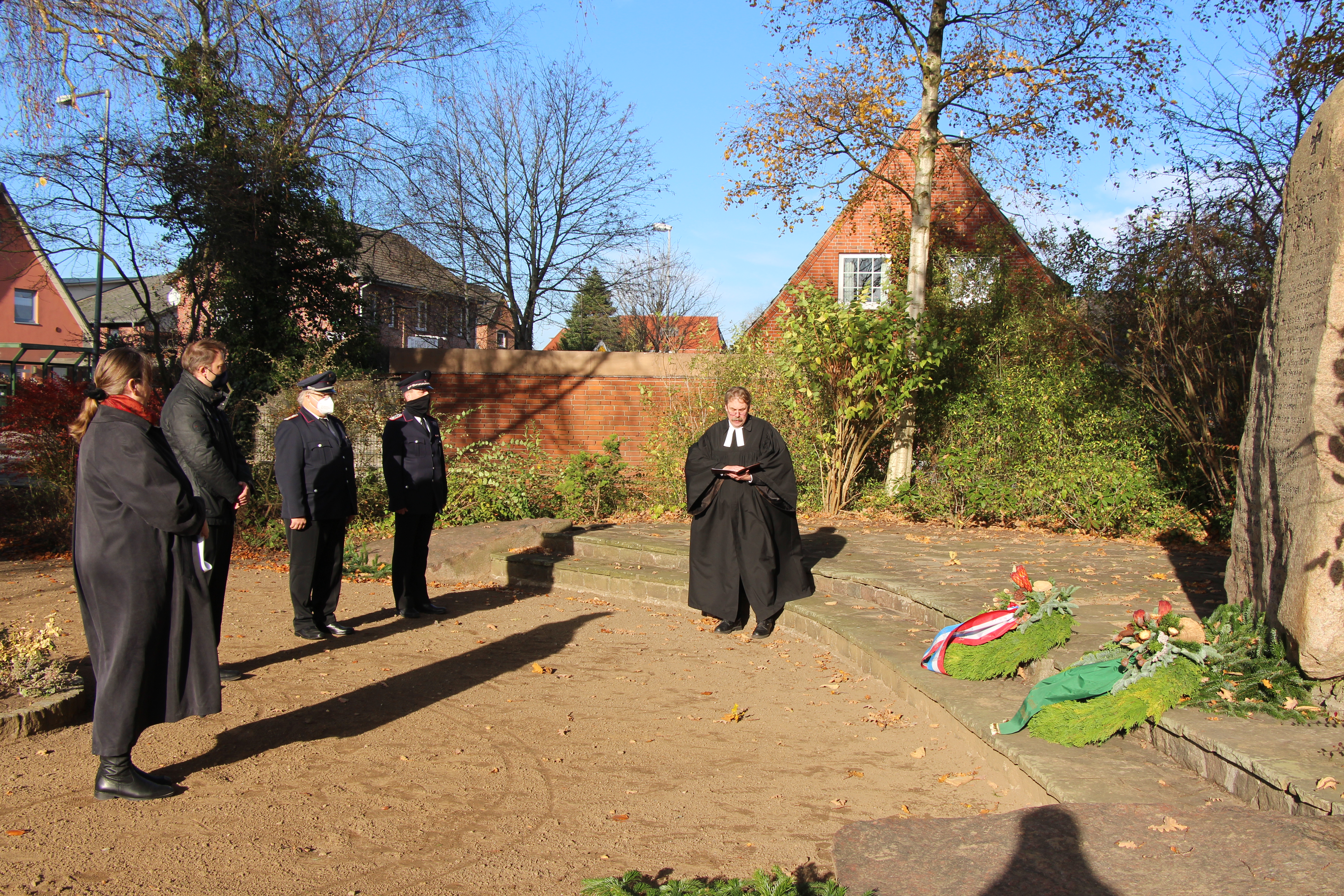 Aufgrund der Corona-Pandemie gab es dieses Jahr leider keine offizielle öffentliche Gedenkstunde am Ehrenmal. Dennoch haben natürlich eine Abordnung der Gemeinde und der Feuerwehr zusammen mit Pastor Feldten in würdigem Rahmen Kränze niedergelegt und den Opfern von Krieg und Gewalt gedacht.