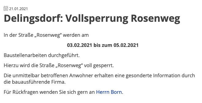 Die unmittelbar betroffenen Anwohner erhalten eine gesonderte Information durch die bauausführende Firma. Für Rückfragen wenden Sie sich gern an Herrn Born.
