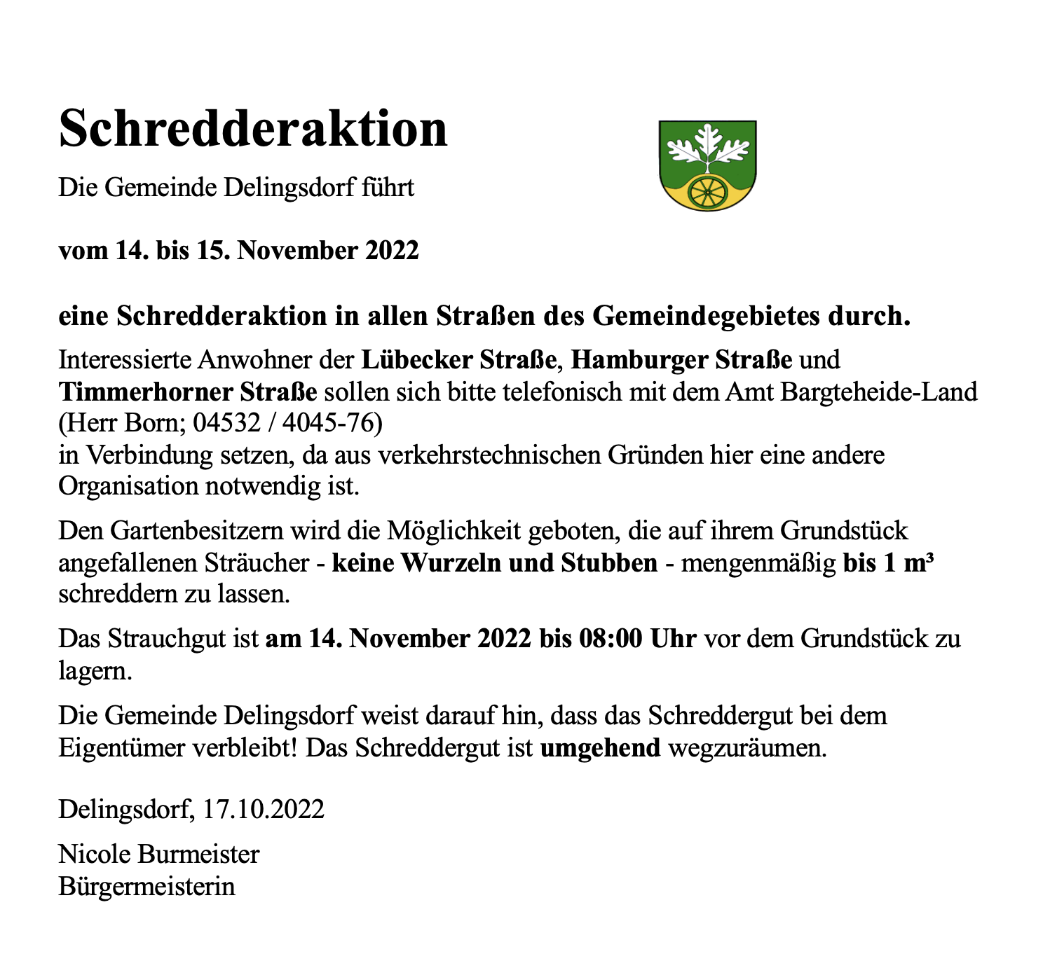Die Gemeinde Delingsdorf führt vom 14. bis 15. November 2022 eine Schredderaktion in allen Straßen des Gemeindegebietes durch.