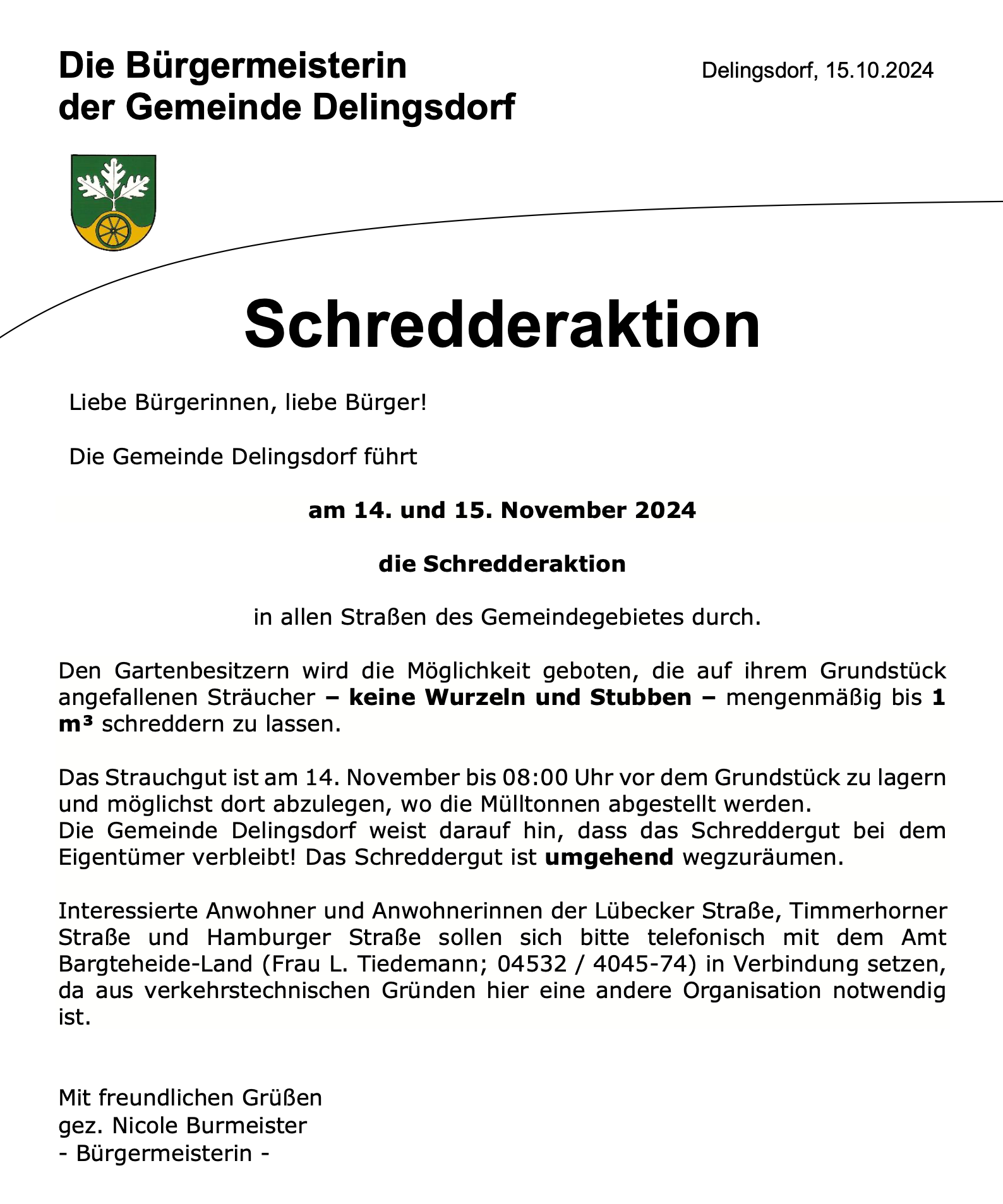 Den Gartenbesitzern wird die Möglichkeit geboten, die auf ihrem Grundstück angefallenen Sträucher – keine Wurzeln und Stubben – mengenmäßig bis 1 m³ schreddern zu lassen. Das Strauchgut ist am 14. November bis 08:00 Uhr vor dem Grundstück zu lagern und möglichst dort abzulegen, wo die Mülltonnen abgestellt werden. Die Gemeinde Delingsdorf weist darauf hin, dass das Schreddergut bei dem Eigentümer verbleibt! Das Schreddergut ist umgehend wegzuräumen. Interessierte Anwohner und Anwohnerinnen der Lübecker Straße, Timmerhorner Straße und Hamburger Straße sollen sich bitte telefonisch mit dem Amt Bargteheide-Land (Frau L. Tiedemann; 04532 / 4045-74) in Verbindung setzen, da aus verkehrstechnischen Gründen hier eine andere Organisation notwendig ist.