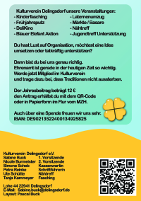 Werden auch Sie eines der über 100 Mitglieder, die die kulturelle ehrenamtliche Arbeit unterstützen. Wir würden uns sehr freuen, wenn wir einige aktive aber auch gern passive Mitglieder dazu bekommen würden, denn es gibt viel zu tun. Die Gemeinde wächst und wir wollen die vielseitigen Angebote gern noch aufstocken.